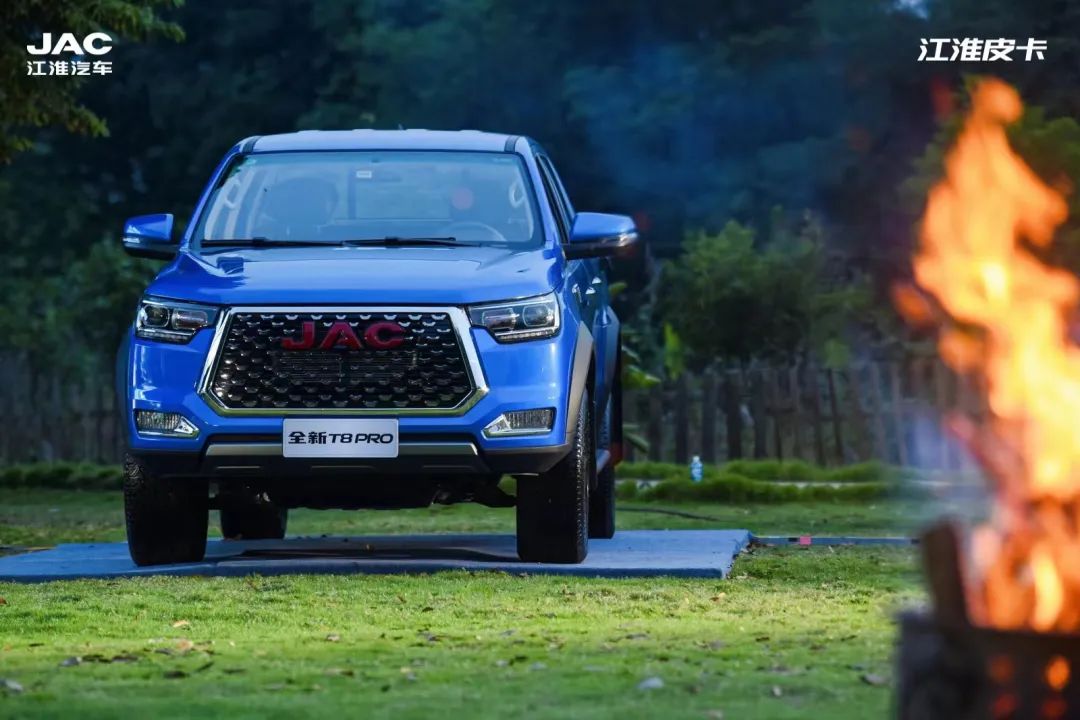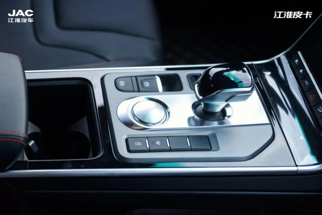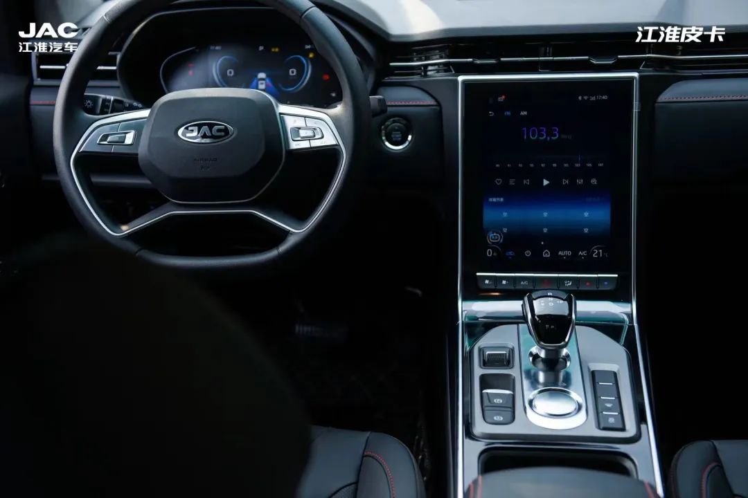 宜商宜家,时尚升级!全新T8 PRO前脸采用星空美学设计理念,银河之舟格栅点阵,灿若繁星又酷似古代元宝,寓意招财进宝,国潮科技感拉满;内部镶嵌中国红“JAC”品牌logo,寓意鸿运当头;骑士鹰眼LED大灯,深邃凌厉,稳重霸气;俯冲式流线型腰线搭配18寸银黑双色铝合金轮辋、四轮声学包轮眉,简约大气,时尚美观。