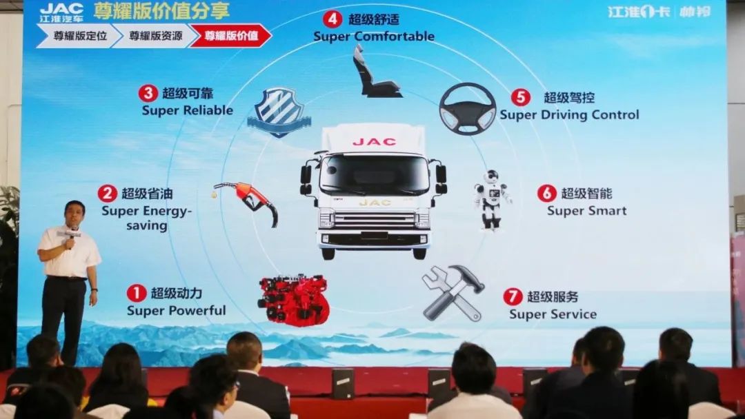 尊耀版给客户带来的价值,总结起来就是7个超级,全新一代安徽康明斯B系发动机带来的超级动力,百公里油耗同比最高节省2升带来的超级省油,超25000小时发动机台架测试带来的超级可靠,2090mm陆地头等舱驾驶室带来的超级舒适;丝滑转弯转向助力带来的超级驾控,远程操控及智能出行带来的超级智能,智尊服务再升级带来的超级服务,当然7个超级价值还有更多细节等待广大客户去探索及发掘。